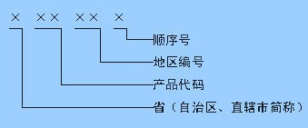 四、生產登記批準書采用全國可識別的編號方法,由省(自治區、直轄市)簡稱、產品代號、地區編號、順序號組成,如下圖所示: