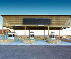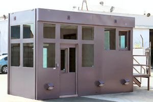 美國BIGEnterprises,Inc公司新開發了一種雙層的、可應對極端天氣情況的崗亭,主要用于邊境檢查站。該崗亭被巨大的圍墻環繞,在極端天氣情況下檢查過往的卡車或是其他交通工具。警衛站在崗亭內,可以直接通過目光檢查地面上通過的車輛,而不需要走到崗亭外面去。該設施具有很強的防彈性能,并配置了多種供電設施以支持報警、攝像監控和其他通信功能。崗亭頂部裝有空調系統,同時輔助有備用加熱和地板加熱裝置。